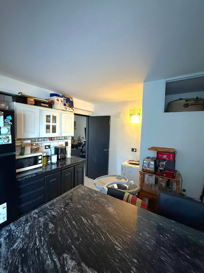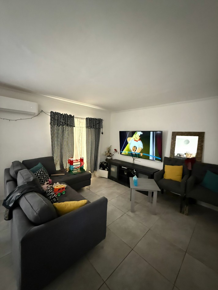 Living comedor con salida a balcón, cocina amoblada con isla, 3 dormitorios y un baño completo.