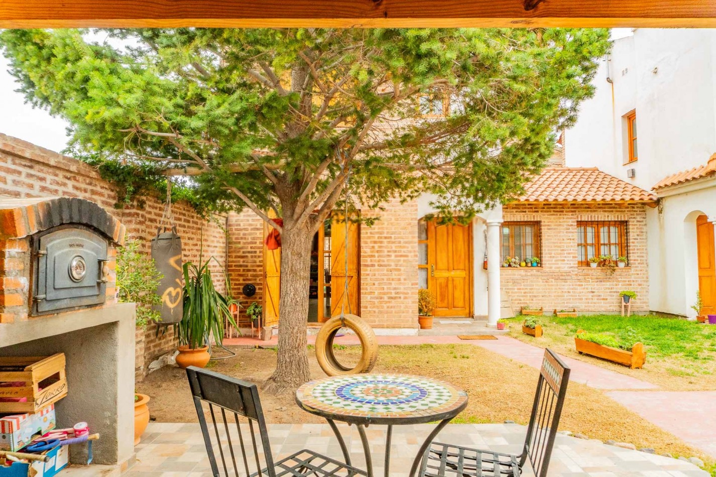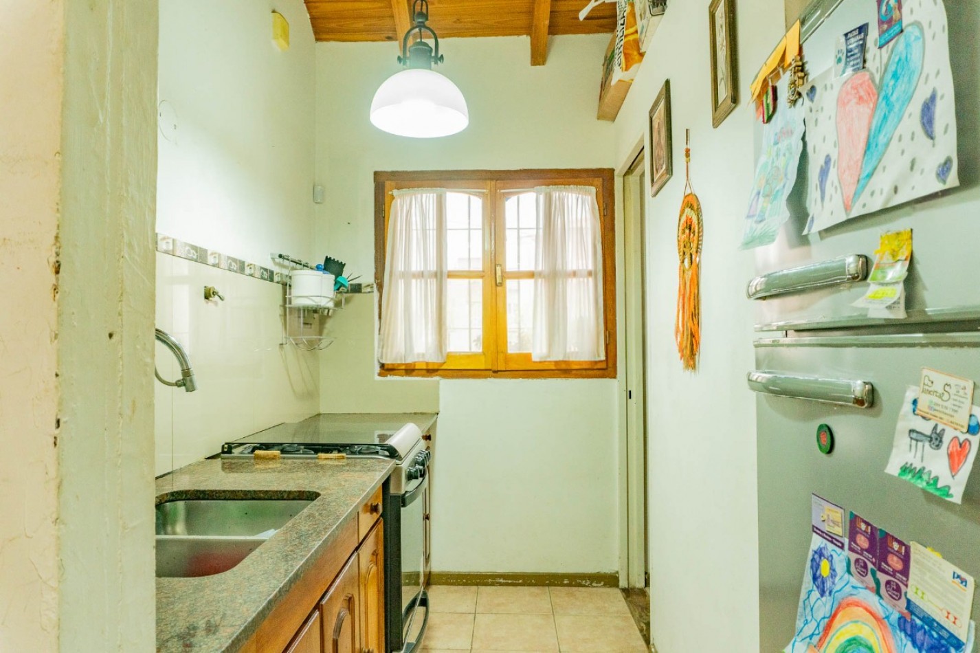 Living-comedor, cocina, toilette, dos dormitorios con placar, baño completo, quincho semicubierto con parrilla, patio trasero cerrado.