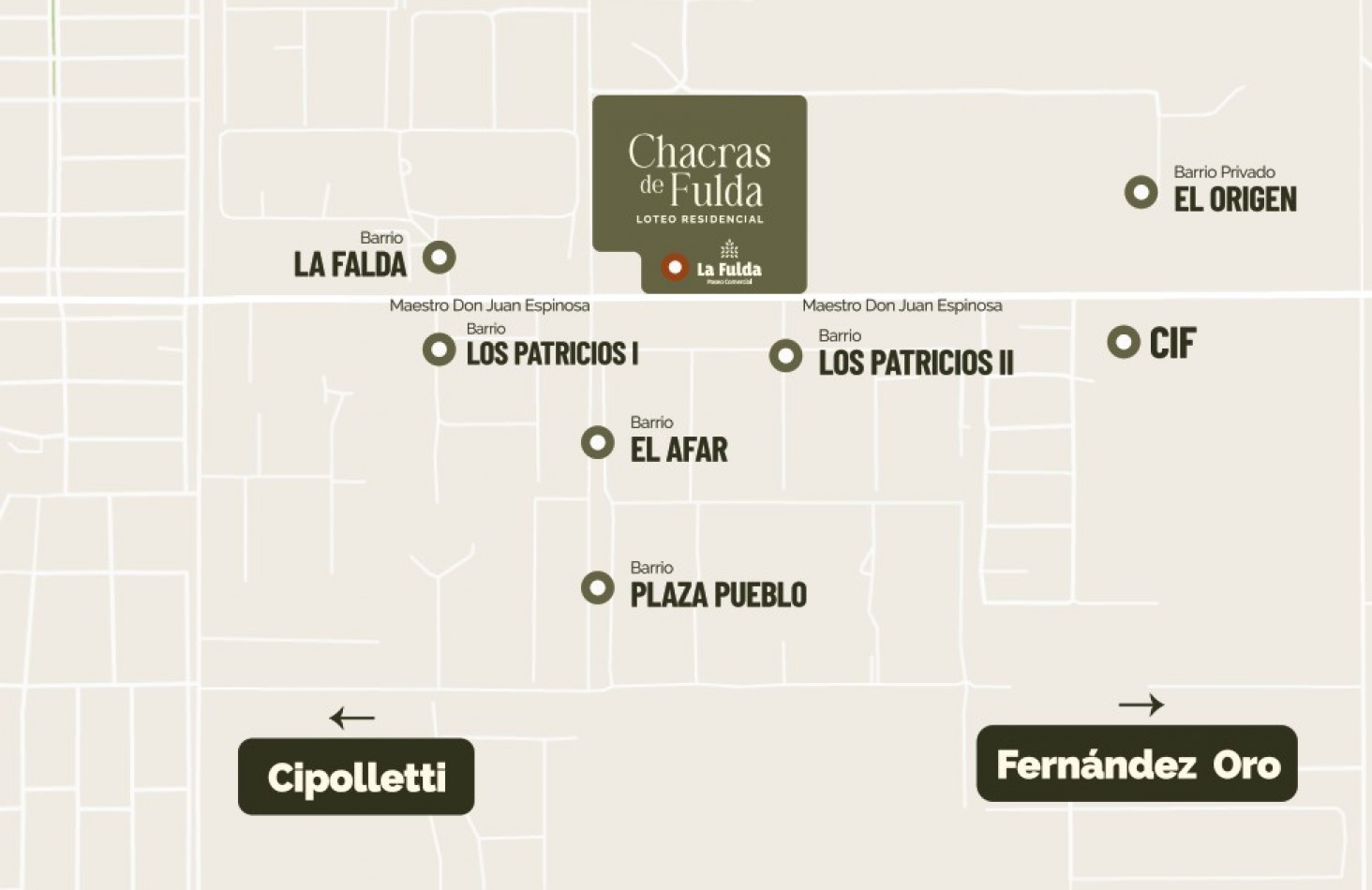 Terrenos en pozo en loteo abierto residencial Chacras de Fulda, sobre calle Maestro Don Juan Espinoza al 3000, entre los Barrios La Falda y El Origen, Cipolletti.